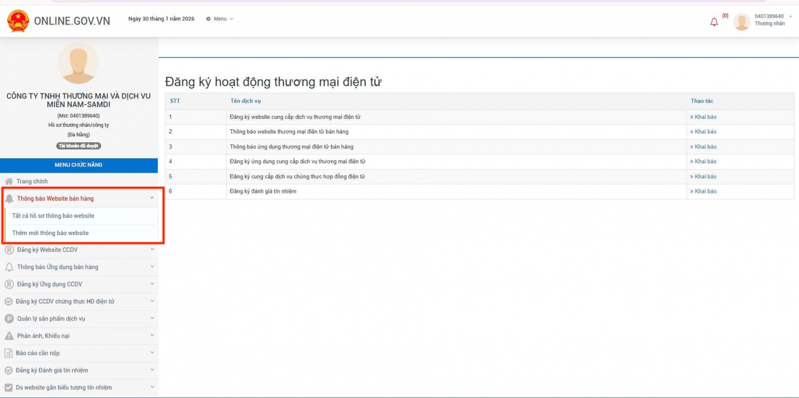 - Sau đăng nhập, quý vị chọn “Chỉnh sửa thông tin DN” để đăng ký danh mục dịch vụ công cần thực hiện => “Danh sách dịch vụ Công” => tại “Danh sách đăng ký” chọn “Thủ tục thông báo, đăng ký TMĐT” => bấm nút “Lưu thông tin”.